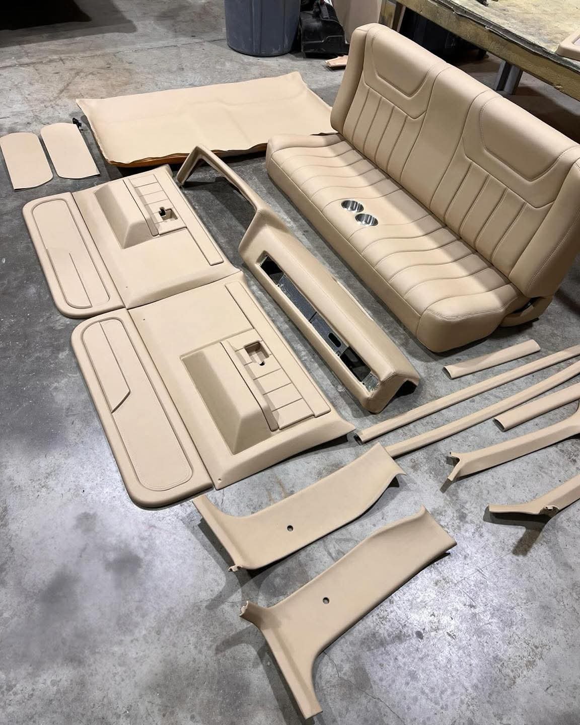 Upgrade your classic C10 with this premium custom interior set, designed specifically for 1973-1987 Chevy C10 trucks. This complete package includes custom leather bucket seats, a center console, and a matching dash, all expertly upholstered for a sleek, cohesive look that enhances both comfort and style.