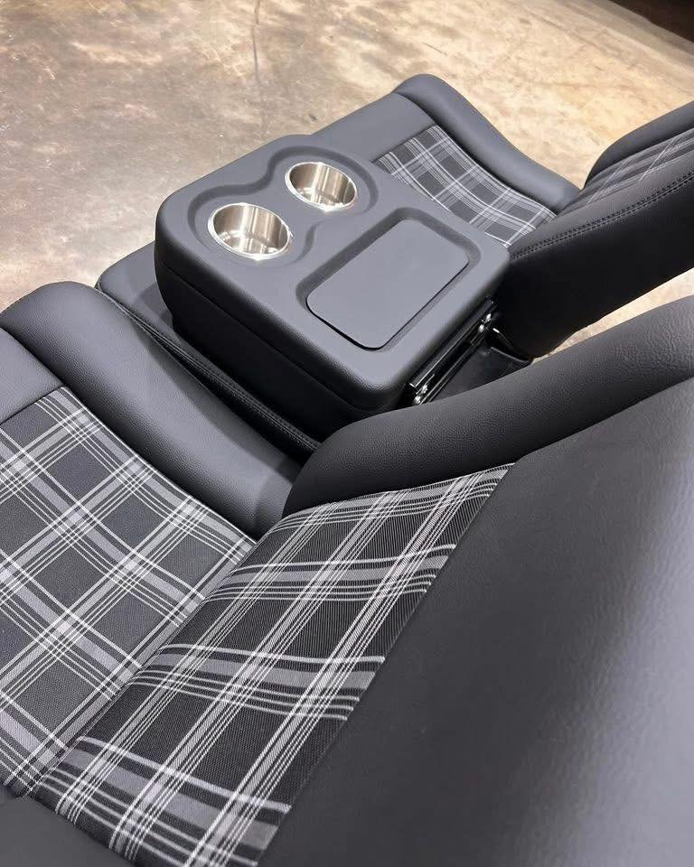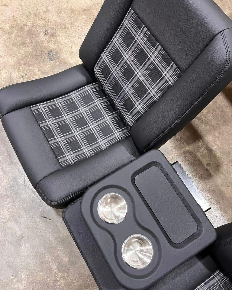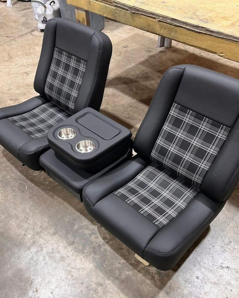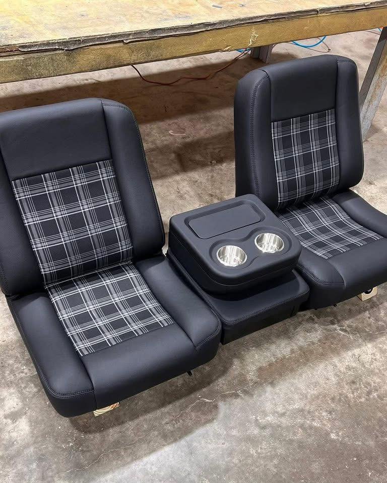 Buddy bucket seats for a 1986 C10, built in black vinyl with plaid inserts with center console